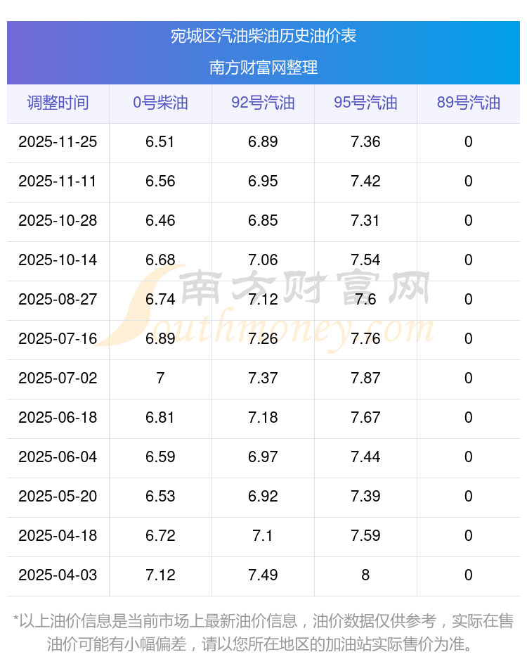 以上數(shù)據(jù)僅供參考,請以您所在地區(qū)的加油站實(shí)際售價(jià)為準(zhǔn)。南方財(cái)富網(wǎng)發(fā)布此信息的目的在于傳播更多信息,對使用該油價(jià)信息所導(dǎo)致的結(jié)果概不承擔(dān)責(zé)任。