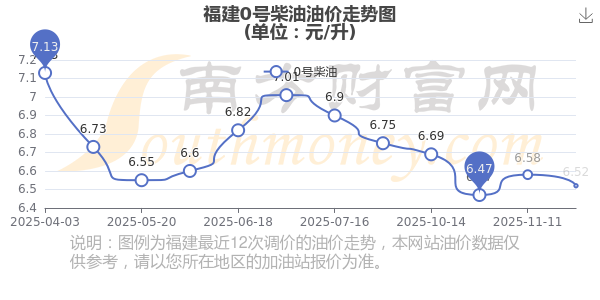 11月30日福建汽油、柴油的價格為11月25日調(diào)整后的價格。每升最新價格為:92號汽油6.86元,降了0.05元;95號汽油7.32元,降了0.06元;89號汽油6.38元,降了0.05;0號柴油6.52元,降了0.06元。