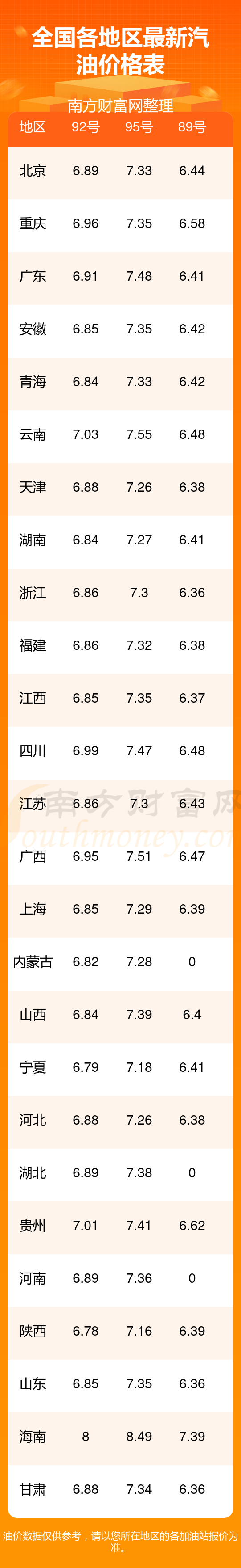 2025年11月30日全國(guó)各地汽油價(jià)格表一覽