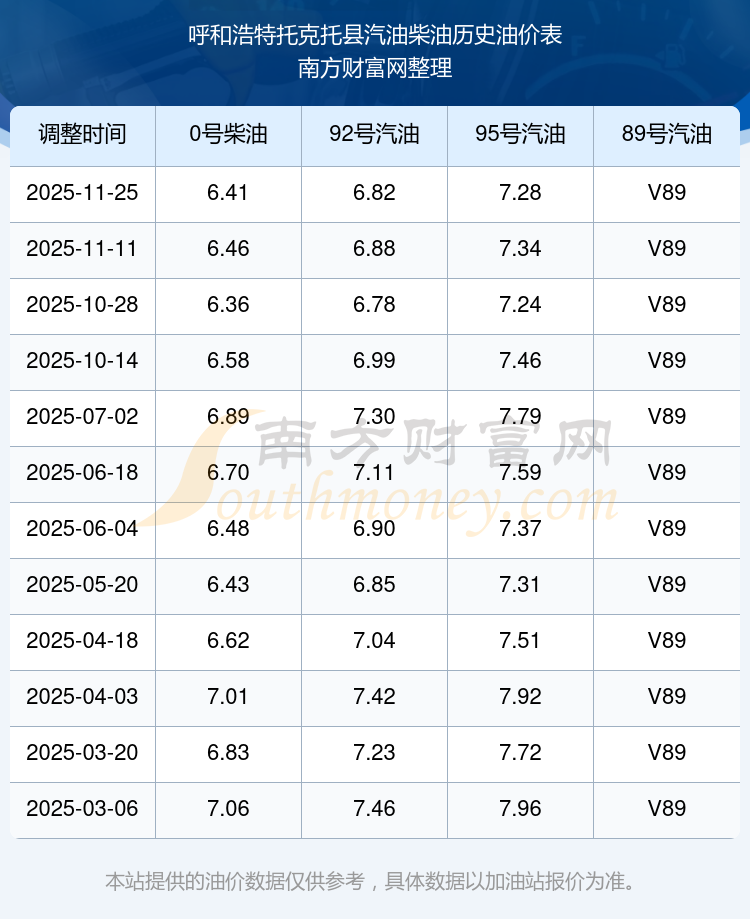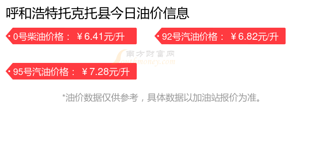呼和浩特托克托縣汽油、柴油11月30日每升的價格(油價調(diào)整時間11月25日):92號汽油6.82元;95號汽油7.28元;0號柴油6.41元。