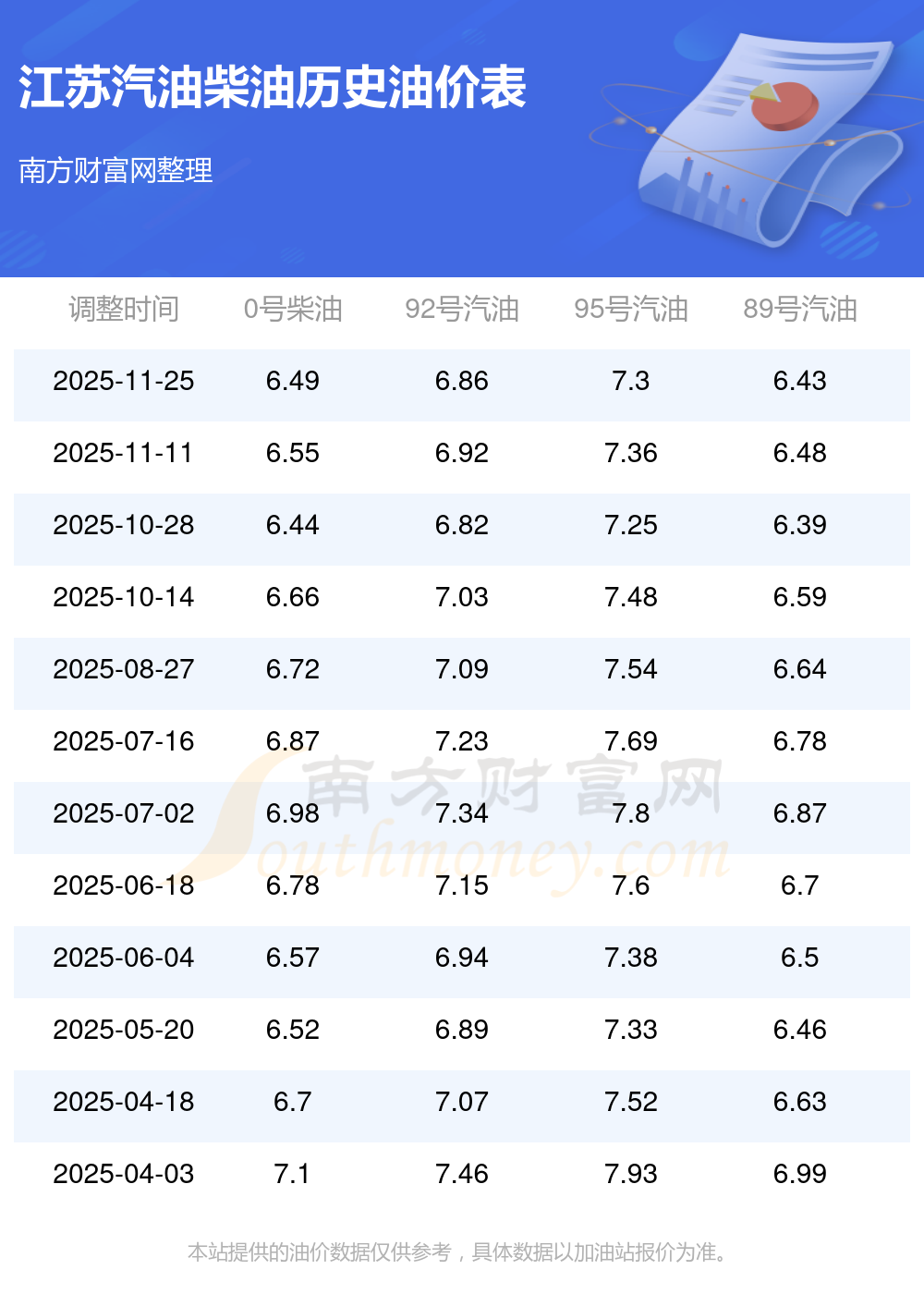 11月30日,江蘇0號柴油的價格是6.49元每升,本次的調整時間為11月25日,對比上次的調整下調了0.06元,下調0.916%,12月8日24時為下一輪油價調整時間,還有8.37天。