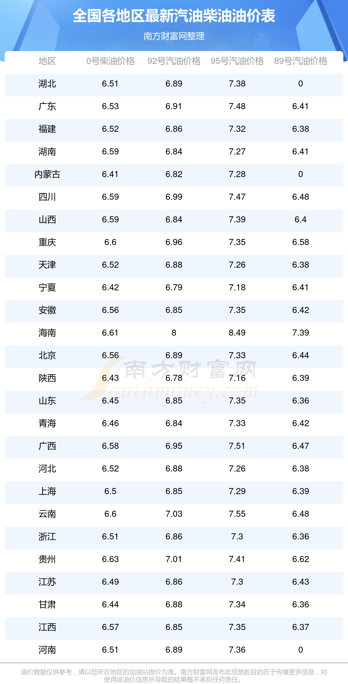 油價數(shù)據(jù)僅供參考,請以您所在地區(qū)的各加油站報價為準(zhǔn)。