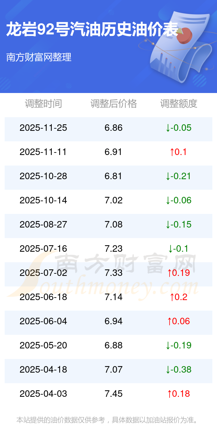 11月30日龍巖92號汽油的價格為11月25日調(diào)整后的價格,具體為:6.86元每升,相對上次調(diào)整時間11月11日的油價6.91元每升,降了0.05元,降幅達(dá)0.724%。下一輪油價調(diào)整時間12月8日24時,距離現(xiàn)在還有8.36天。