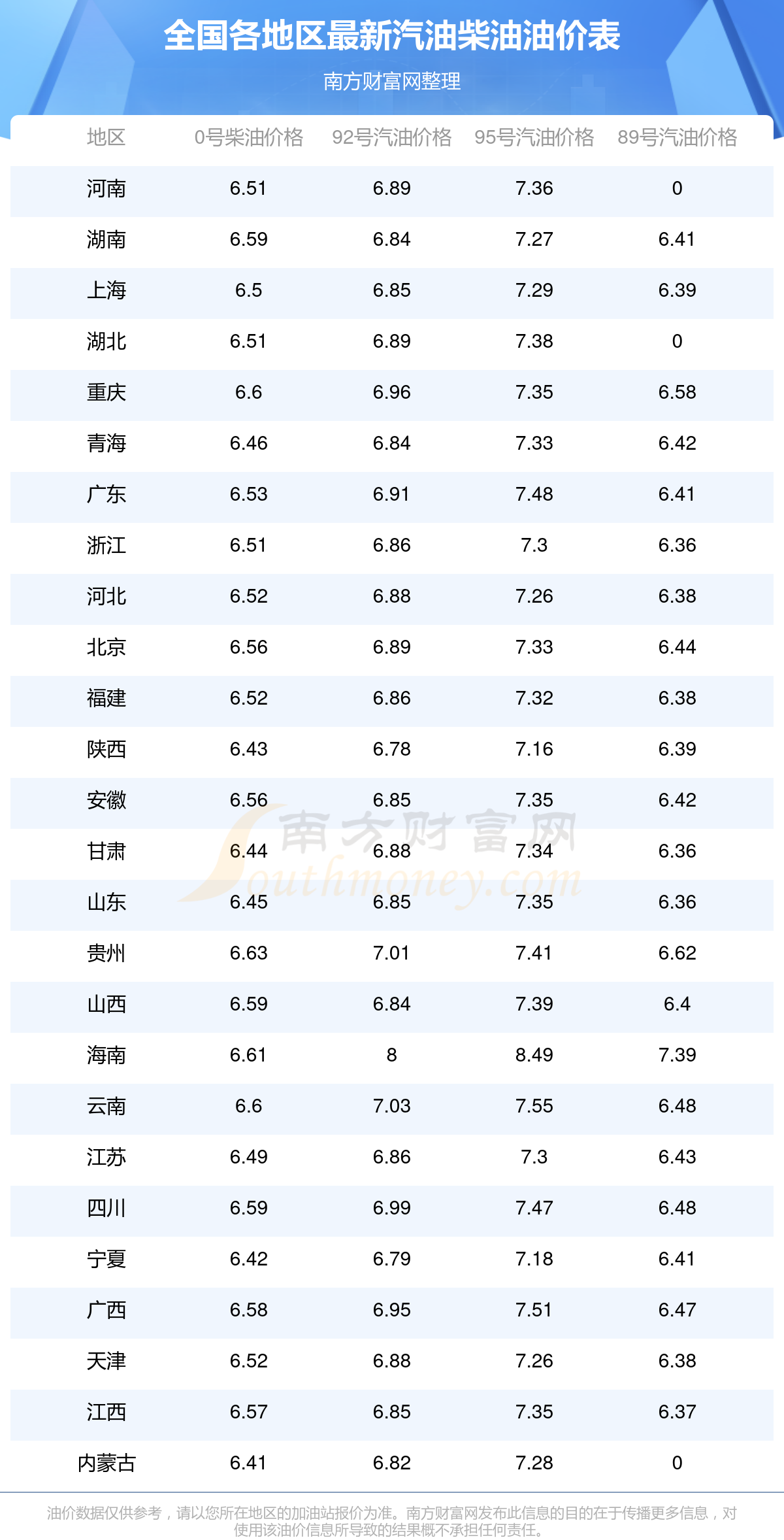 全國(guó)89號(hào)汽油平均價(jià)格為:6元每升,其中,最低為浙江,價(jià)格6.36元/升,最高為海南,價(jià)格7.39元/升。