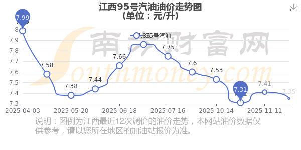 11月30日,江西95號(hào)汽油的價(jià)格是7.35元每升,本次的調(diào)整時(shí)間為11月25日,對(duì)比上次的調(diào)整下跌了0.06元,下跌0.81%,12月8日24時(shí)為下一輪油價(jià)調(diào)整時(shí)間,還有8.35天。