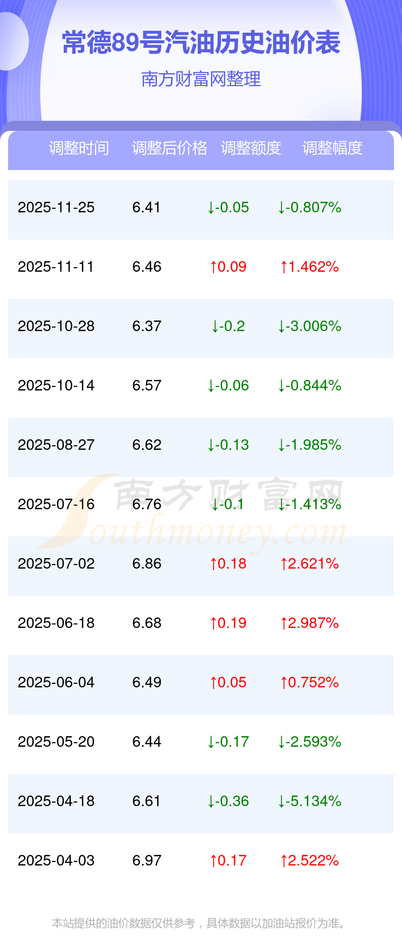 11月30日常德89號汽油的價格為6.41元/升,本輪油價的調(diào)整時間為11月25日,相對上一輪油價調(diào)整時間11月11日的價格6.46元/升,降了0.05元,降幅達0.807%。