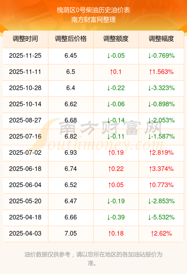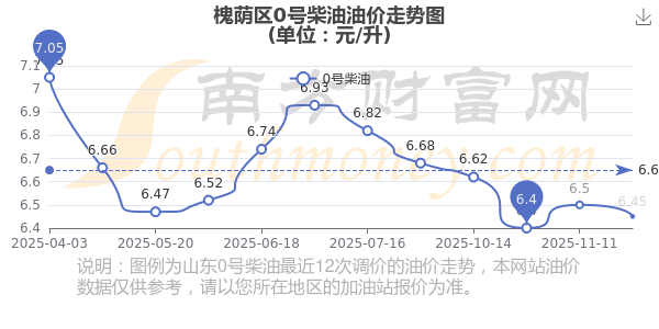 槐蔭區(qū)0號柴油11月30日最新價格為6.45元/升,為11月25日油價調(diào)整后的價格,相對上次調(diào)整時間11月11日的油價6.5元每升,跌了0.05元,跌0.769%。