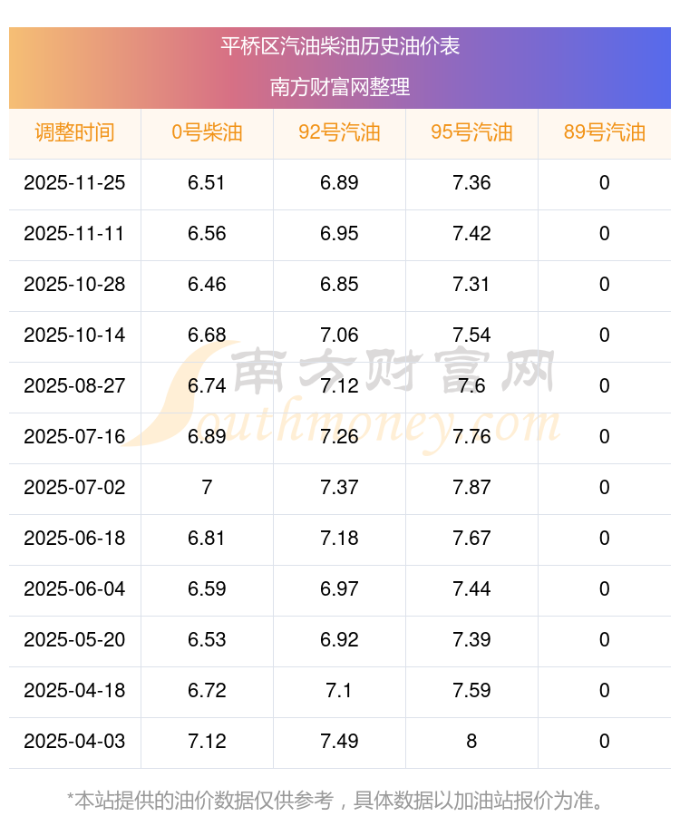11月30日平橋區(qū)汽油、柴油每升的價(jià)格是多少?詳情如下:95號(hào)汽油為7.36元,減了0.06元;92號(hào)汽油為6.89元,減了0.06元;0號(hào)柴油為6.51元,減了0.05元,調(diào)整時(shí)間為11月25日。