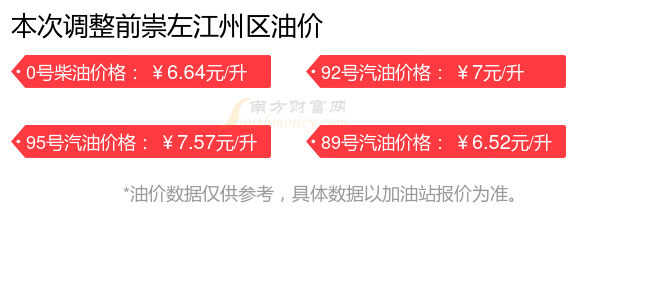 崇左江州區(qū)汽油柴油11月30日的價格每升多少錢?具體為:92號汽油為6.95元,下跌了0.05元;95號汽油為7.51元,下跌了0.06元;89號汽油為6.47元,下跌了0.05元;0號柴油為6.58元,下跌了0.06元,本輪油價的調(diào)整時間為11月25日。