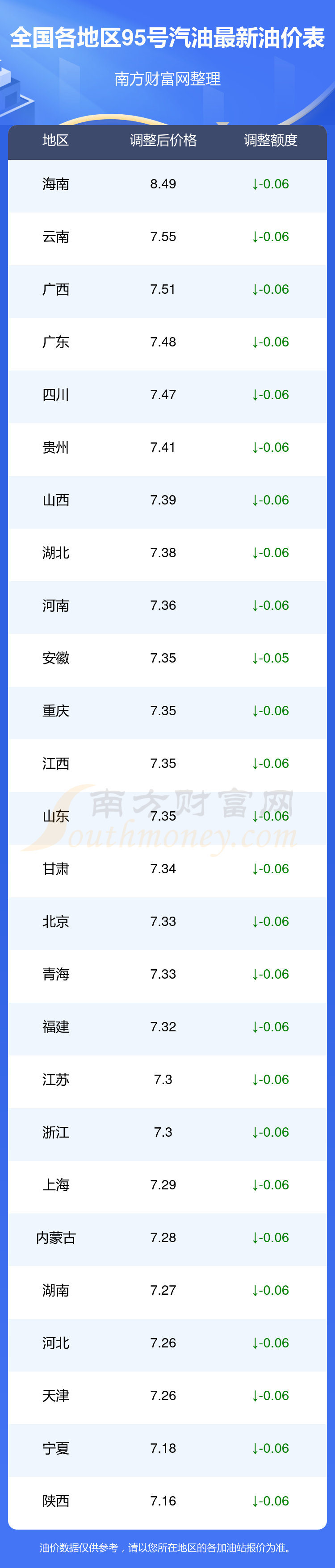 11月30日,全國95號汽油的最新價(jià)格是11月25日油價(jià)調(diào)整后的價(jià)格,具體為:平均價(jià)格7元/升,最低的是陜西,價(jià)格7.16元/升,最高的是海南,價(jià)格8.49元/升。