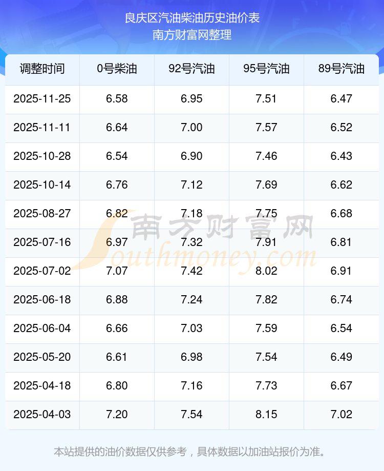 良慶區(qū)汽油、柴油11月30日每升的價(jià)格為11月25日調(diào)整后的價(jià)格:92號(hào)汽油6.95元;95號(hào)汽油7.51元;89號(hào)汽油6.47元;0號(hào)柴油6.58元。