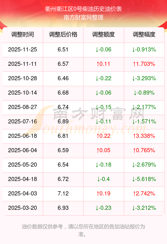 11月30日衢州衢江區(qū)0號(hào)柴油歷史油價(jià)一覽表