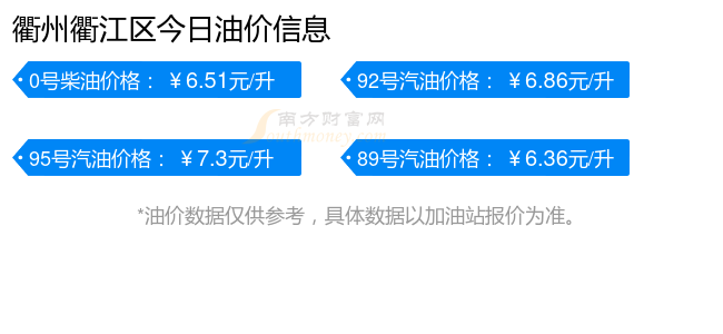 11月30日,衢州衢江區(qū)汽油、柴油每升最新價(jià)格為:92號(hào)汽油為6.86元,降了0.06元;95號(hào)汽油為7.3元,降了0.06元;89號(hào)汽油為6.36元,降了0.05元;0號(hào)柴油為6.51元,降了0.06元,調(diào)整時(shí)間為11月25日。