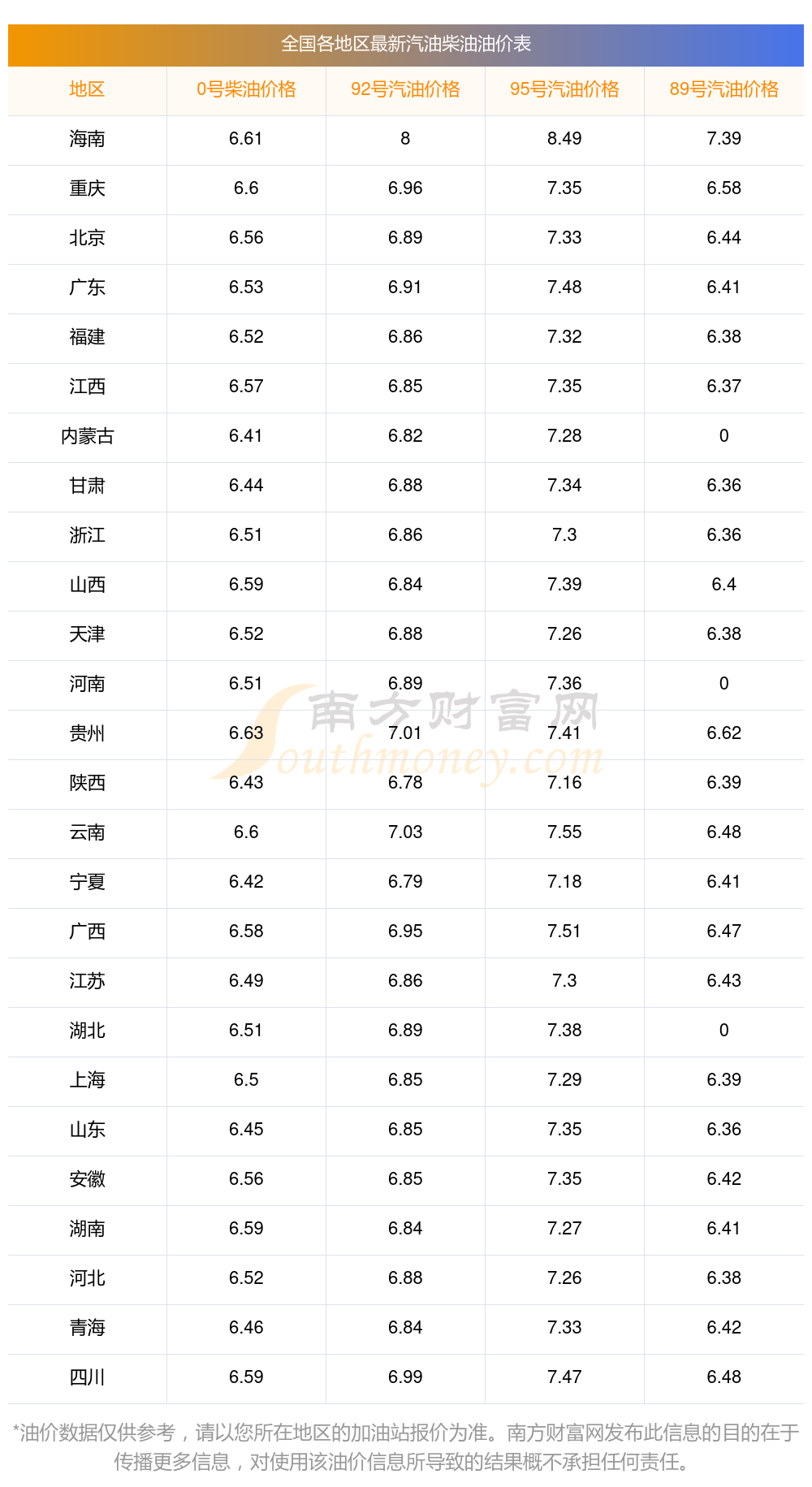 全國各地區(qū)最新油價表