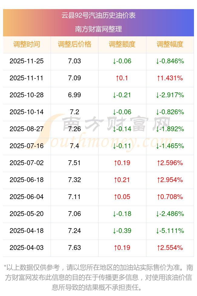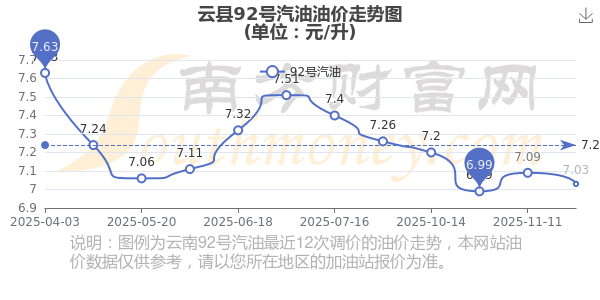 11月30日云縣92號汽油的價格是7.03元/升(油價調(diào)整時間11月25日),相對上一輪油價調(diào)整時間11月11日的價格7.09元/升,下跌了0.06元,下跌幅達0.846%。