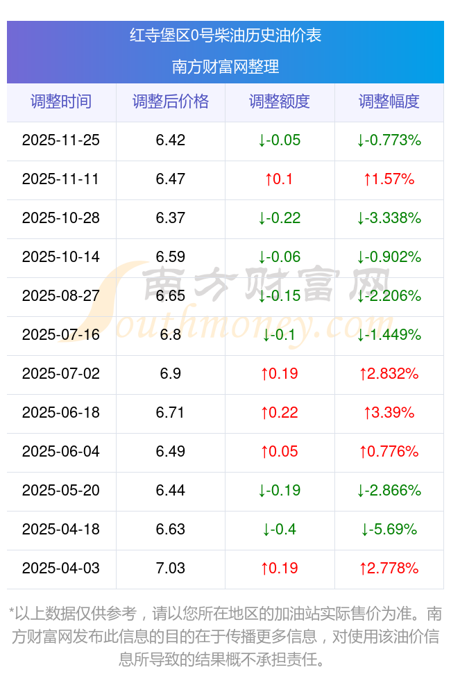 11月30日紅寺堡區(qū)0號柴油價格查詢:每升6.42元(11月25日油價調整后的價格),相對上次調整時間11月11日的油價6.47元每升,下調了0.05元,下調0.773%。