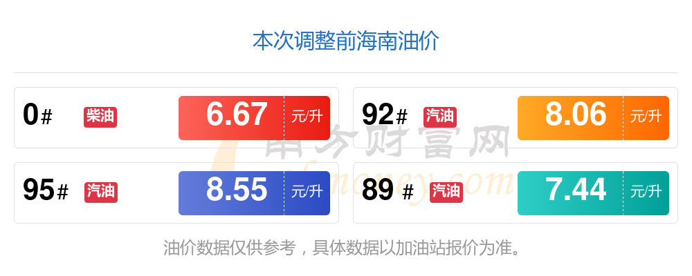 海南汽油、柴油11月30日每升的價格是多少?具體為:92號汽油為8元;95號汽油為8.49元;89號汽油為7.39元,下降了0.05;0號柴油為6.61元,本輪調(diào)整時間為11月25日。