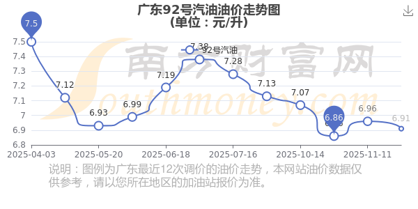 11月30日,廣東92號汽油的價格是6.91元每升,本次的調(diào)整時間為11月25日,對比上次的調(diào)整下降了0.05元,下降0.718%,12月8日24時為下一輪油價調(diào)整時間,還有8.29天。