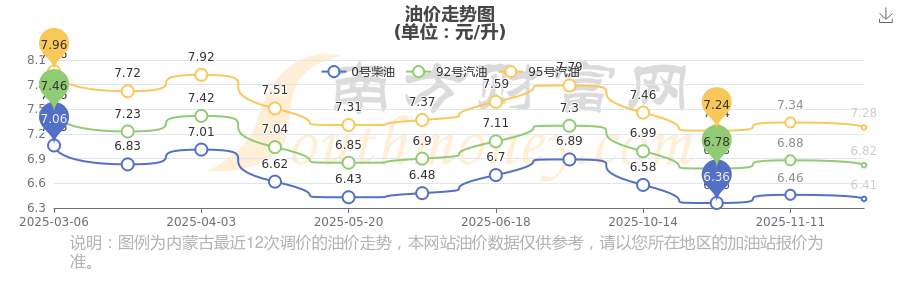11月30日,內(nèi)蒙古包頭95號汽油最新價格為7.28元/升,調(diào)整時間為11月25日,相對上次調(diào)整下跌了0.06元。下一輪油價調(diào)整時間12月8日24時,距離現(xiàn)在還有8.28天。