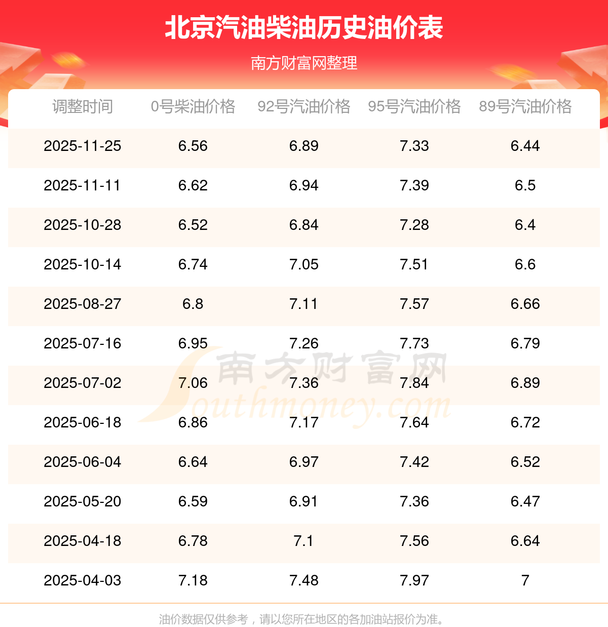 汽油價格調(diào)整最新消息:下一輪油價調(diào)整時間12月8日24時。北京汽油、柴油11月30日每升的價格是多少?具體為:92號汽油為6.89元;95號汽油為7.33元;89號汽油為6.44元,減了0.06;0號柴油為6.56元,本輪調(diào)整時間為11月25日。