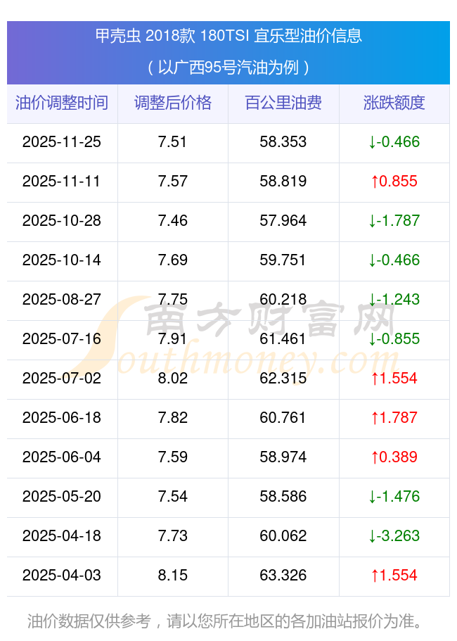 根據(jù)11月25日95號汽油最新調(diào)整價格7.51元/升來計算(以廣西為例),該車型每百公里的平均油費是58.353元,上一輪11月11日調(diào)整價格7.57元每升來計算,每百公里的平均油費是58.819元,對比上一輪少花0.466元,下一輪的油價調(diào)整時間是12月8日24時。