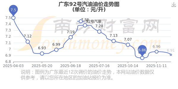 11月30日,廣東92號汽油的價格是6.91元每升,本次的調(diào)整時間為11月25日,對比上次的調(diào)整下調(diào)了0.05元,下調(diào)0.718%,下次調(diào)整時間為12月8日24時,還有8.27天。