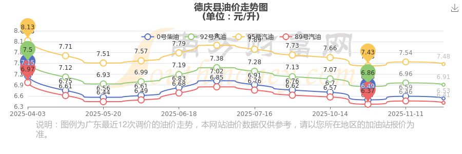 11月30日德慶縣汽油、柴油每升的價格是11月25日調整后的價格:92號汽油為6.91元,下降了0.05元,下降幅達0.72%;95號汽油為7.48元,下降了0.06元,下降幅達0.8%;89號汽油為6.41元,下降了0.05元,下降幅達0.77%;0號柴油為6.53元,下降了0.06元,下降幅達0.91%。