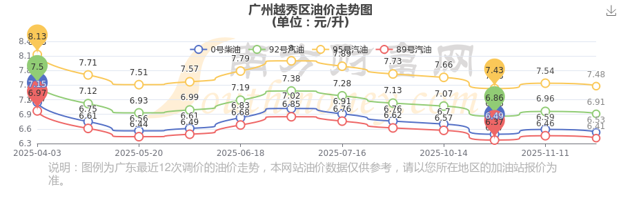 廣州越秀區(qū)11月30日95號(hào)汽油歷史油價(jià)調(diào)整走勢(shì)圖
