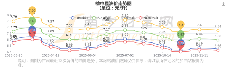 11月30日榆中縣汽油、柴油價格是11月25日調(diào)整后的價格,每升價格具體為:92號汽油為6.88元,減了0.06元,減幅達(dá)0.87%;95號汽油為7.34元,減了0.06元,減幅達(dá)0.81%;89號汽油為6.36元,減了0.05元,減幅達(dá)0.78%;0號柴油為6.44元,減了0.05元,減幅達(dá)0.77%。