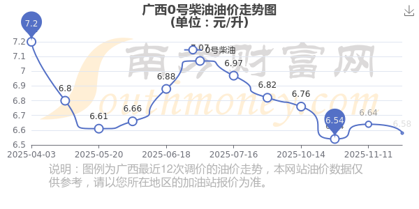 11月30日,廣西0號柴油的價格是6.58元每升,本次的調(diào)整時間為11月25日,對比上次的調(diào)整下降了0.06元,下降0.904%,下次調(diào)整時間為12月8日24時,還有8.26天。