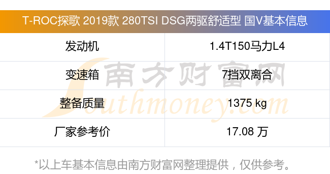 T-ROC探歌 2019款 280TSI DSG兩驅(qū)舒適型 國V動力上配備的是一臺1.4T150馬力L4渦輪增壓發(fā)動機,匹配的是7擋雙離合自動檔變速箱,燃料形式為汽油,常規(guī)整備質(zhì)量1375kg,廠家參考價17.08萬元。
