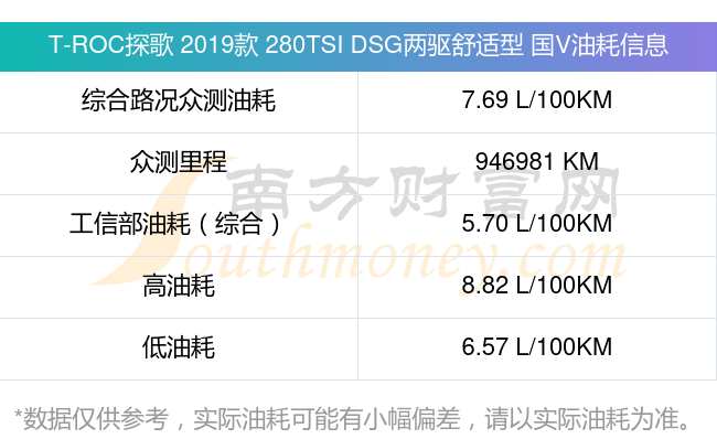 根據(jù)車主實測數(shù)據(jù),該車型低油耗為6.57升每百公里,高油耗為8.82升每百公里,綜合路況眾測油耗為7.69升每百公里,工信部綜合油耗為5.70升每百公里。