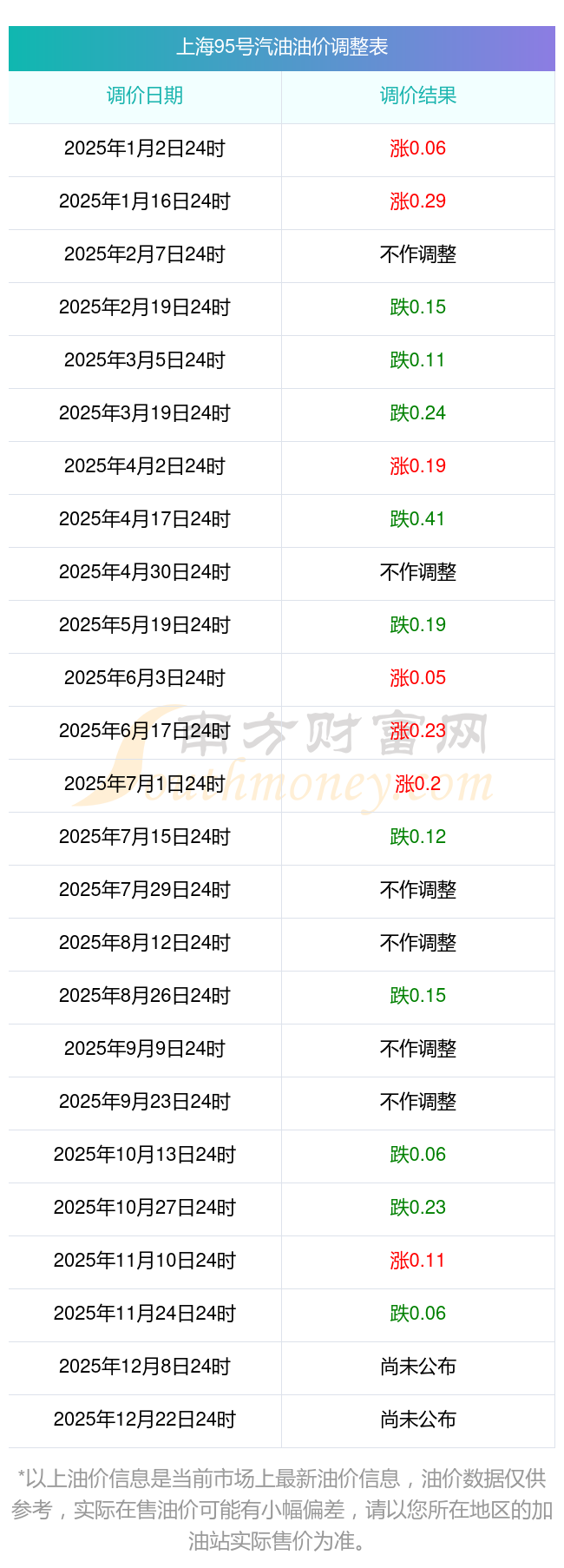 上海2025年油價調(diào)整時間及價格表