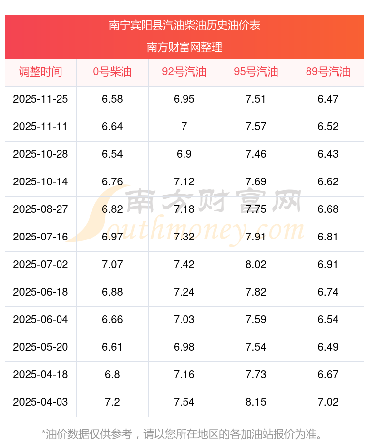 南寧賓陽(yáng)縣歷史油價(jià)表