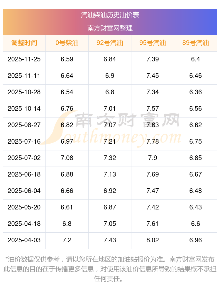 2025年95號汽油價格一覽表