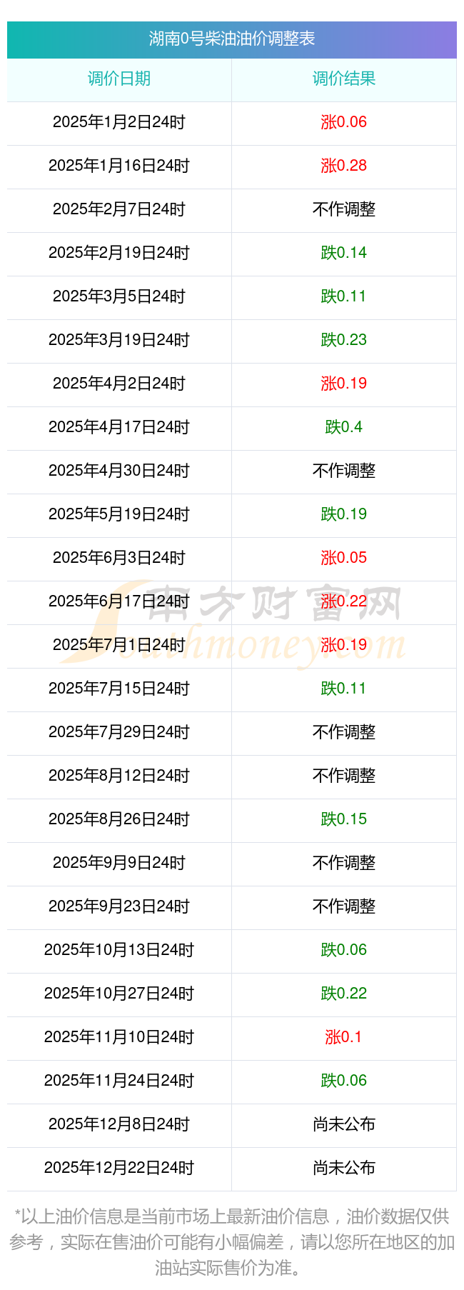 11月30日,湖南0號(hào)柴油的價(jià)格是6.59元每升,本次的調(diào)整時(shí)間為11月25日,對(duì)比上次的調(diào)整跌了0.06元,跌0.844%,12月8日24時(shí)為下一輪油價(jià)調(diào)整時(shí)間,還有8.24天。