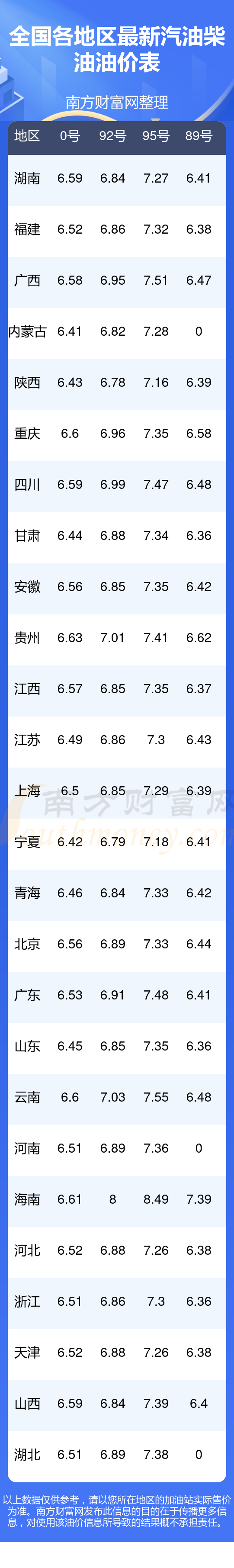 以上數(shù)據(jù)僅供參考,請(qǐng)以您所在地區(qū)的加油站實(shí)際售價(jià)為準(zhǔn)。南方財(cái)富網(wǎng)發(fā)布此信息的目的在于傳播更多信息,對(duì)使用該油價(jià)信息所導(dǎo)致的結(jié)果概不承擔(dān)責(zé)任。