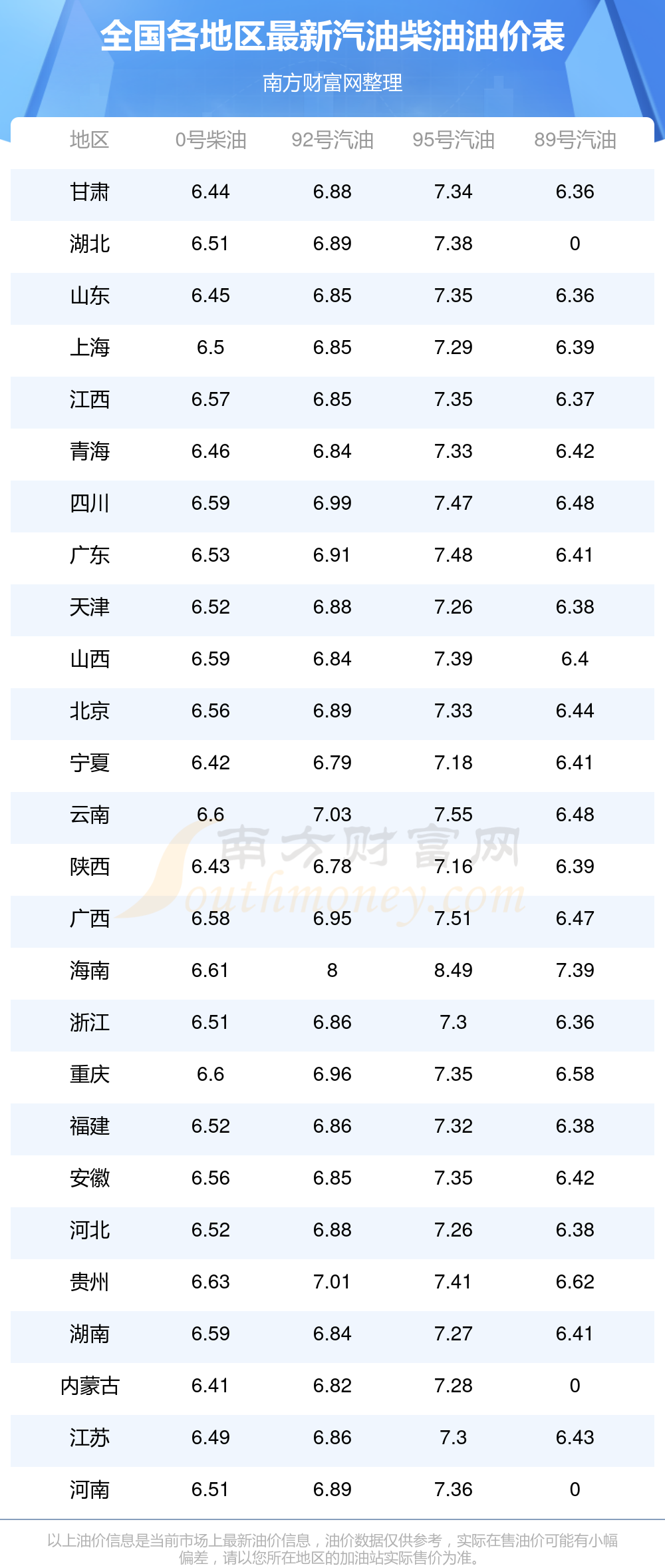 全國各地區(qū)2025年最新汽油價格表