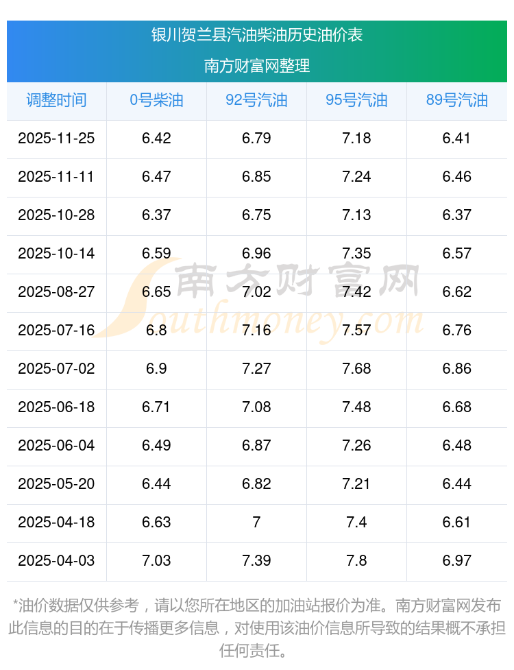 11月30日銀川賀蘭縣汽油、柴油每升的價格是11月25日調(diào)整后的價格:92號汽油為6.79元,降了0.06元,降幅達(dá)0.88%;95號汽油為7.18元,降了0.06元,降幅達(dá)0.83%;89號汽油為6.41元,降了0.05元,降幅達(dá)0.77%;0號柴油為6.42元,降了0.05元,降幅達(dá)0.77%。