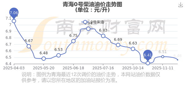 11月30日,青海0號柴油的價格是6.46元每升,本次的調整時間為11月25日,對比上次的調整下調了0.05元,下調0.768%,12月8日24時為下一輪油價調整時間,還有8.22天。