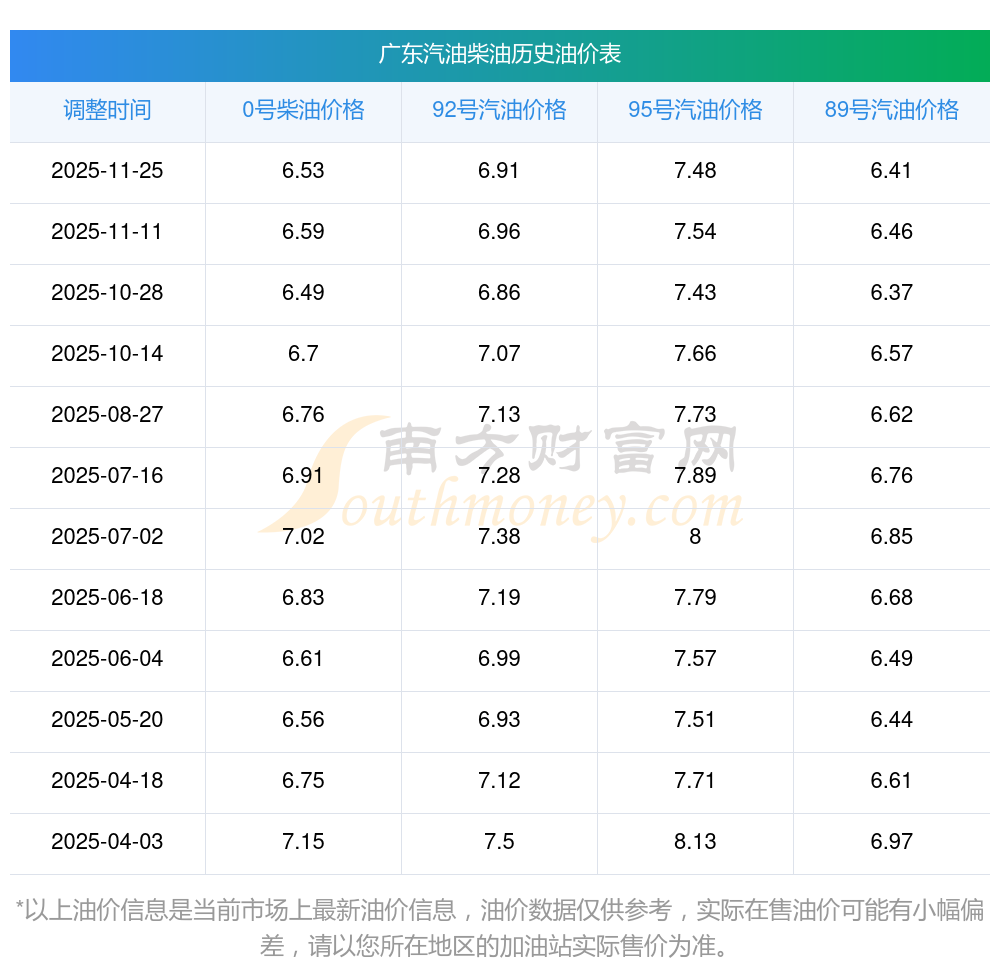廣東2025年最新汽油柴油歷史油價(jià)表