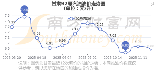 11月30日,甘肅92號(hào)汽油的價(jià)格是6.88元每升,本次的調(diào)整時(shí)間為11月25日,對(duì)比上次的調(diào)整下調(diào)了0.06元,下調(diào)0.865%,下次調(diào)整時(shí)間為12月8日24時(shí),還有8.22天。