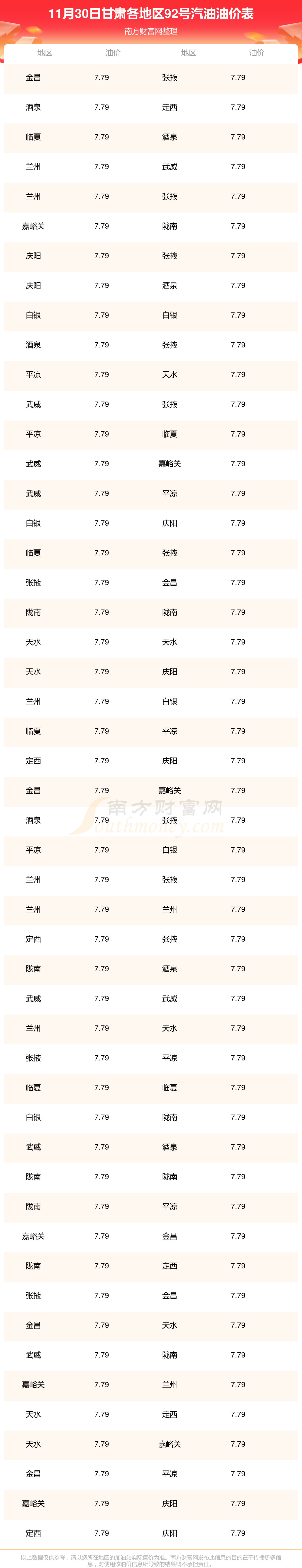 甘肅各地區(qū)最新92號(hào)汽油油價(jià)表