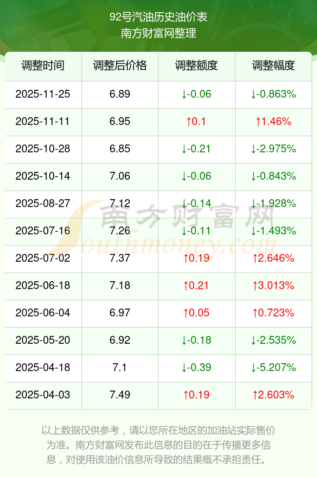 11月30日汽油、柴油的價格是11月25日調(diào)整后的價格,每升價格為:92號汽油為6.89元,下跌了0.06元,下跌幅達0.86%;95號汽油為7.36元,下跌了0.06元,下跌幅達0.81%;0號柴油為6.51元,下跌了0.05元,下跌幅達0.76%。下一輪油價調(diào)整時間12月8日24時,距離現(xiàn)在還有8.21天。