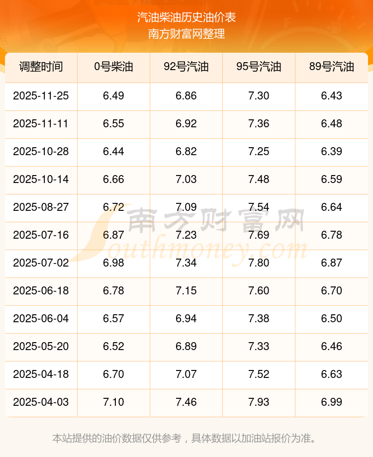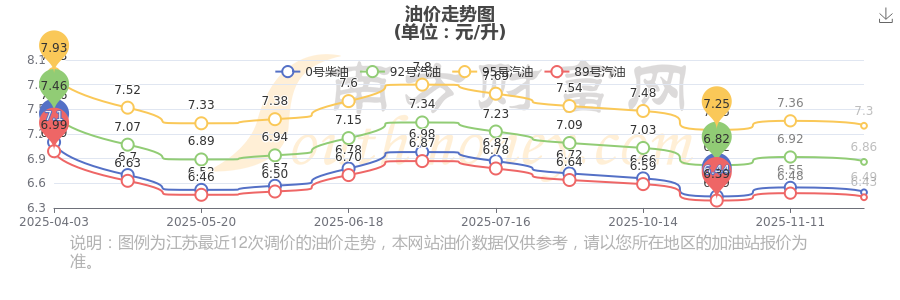 11月30日,江蘇揚州92號汽油的價格為6.86元/升,這是11月25日油價調(diào)整后的價格,對比上一輪油價調(diào)整時間11月11日的價格6.92元每升,下降了0.06元,下降幅達0.867%。下一輪油價調(diào)整時間12月8日24時,距離現(xiàn)在還有8.2天。