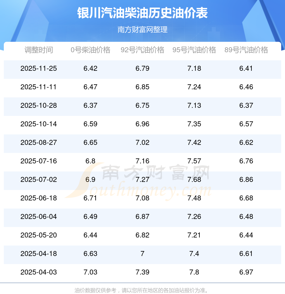 銀川汽油、柴油11月30日每升的價(jià)格具體是(11月25日調(diào)整后的價(jià)格):92號(hào)汽油6.79元;95號(hào)汽油7.18元;89號(hào)汽油6.41元;0號(hào)柴油6.42元。