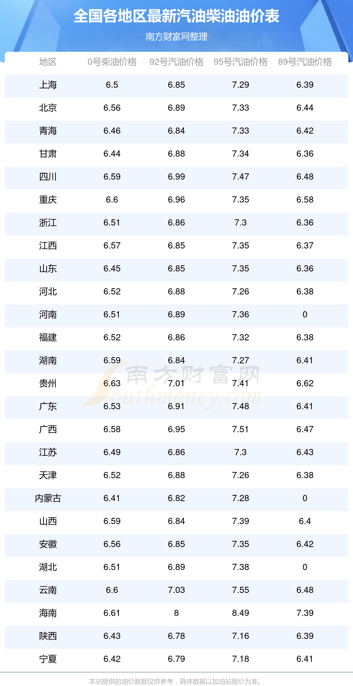 油價(jià)數(shù)據(jù)僅供參考,請(qǐng)以您所在地區(qū)的加油站報(bào)價(jià)為準(zhǔn)。南方財(cái)富網(wǎng)發(fā)布此信息的目的在于傳播更多信息,對(duì)使用該油價(jià)信息所導(dǎo)致的結(jié)果概不承擔(dān)任何責(zé)任。