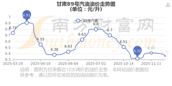 11月30日,甘肅89號(hào)汽油的價(jià)格是6.36元每升,本次的調(diào)整時(shí)間為11月25日,對(duì)比上次的調(diào)整跌了0.05元,跌0.78%,12月8日24時(shí)為下一輪油價(jià)調(diào)整時(shí)間,還有8.18天。