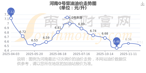 11月30日,河南0號(hào)柴油的價(jià)格是6.51元每升,本次的調(diào)整時(shí)間為11月25日,對(duì)比上次的調(diào)整下降了0.05元,下降0.762%,12月8日24時(shí)為下一輪油價(jià)調(diào)整時(shí)間,還有8.18天。