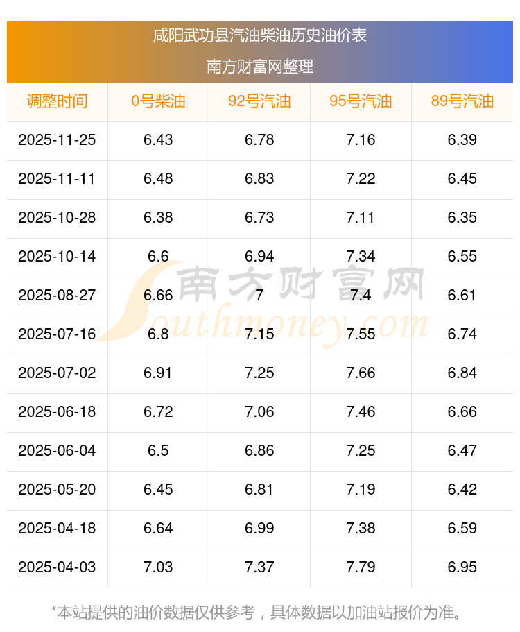 咸陽(yáng)武功縣汽油、柴油11月30日每升的價(jià)格為11月25日調(diào)整后的價(jià)格:92號(hào)汽油6.78元;95號(hào)汽油7.16元;89號(hào)汽油6.39元;0號(hào)柴油6.43元。